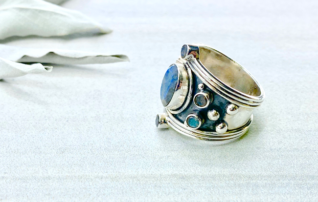 Sterling Silver with Blue Labradorite Gems | Available Sizes: 6, 7, 7.5, 9 | Order at info@ritualjewellery.com