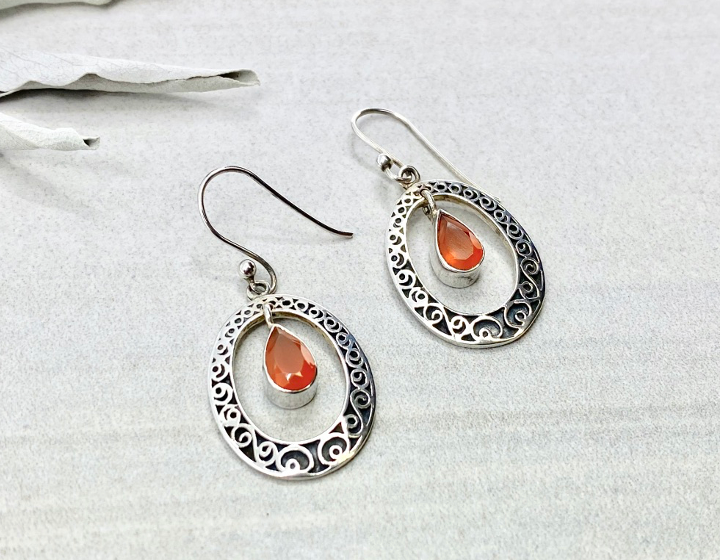 Silver earrings with teardrop-shaped orange stones on a light gray background